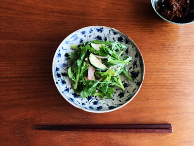 我が家では和食とベトナム料理に使うことが多いお皿です。優しく上品な花唐草模様がとても素敵。藍色の模様は野菜の色がとても映えます。最近、春菊を生のまま食べることが多いのですが、和えただけの料理も美味しく見えますよ(笑)