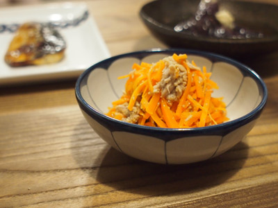 夕飯のおかずには、だいたいメインの大皿+副菜1~2品を出すようにしています。毎日のように使う副菜用小鉢を割ってしまい、次なる候補として選ばれたのがこちらの花小鉢。シンプルながら上品なあたたかみを感じるたたずまいは、つくりおきの常備菜も見違えさせてくれますよ。