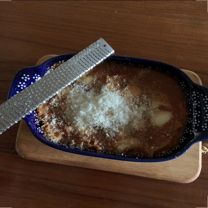 世のチーズ好きの皆さん、エアリーなチーズって食べたことありますか?用意するのはゼスターグレーターとハード系チーズ。おもしろいほど、するすると固いチーズが削れていきます。さっきまであんなに固かったのに、削るとふわっふわの新食感に生まれ変わります。ダイレクトに頬張りたい気持ちをグッと抑えて、ラザニアと一緒に一口。削り立てだからチーズの風味が強く、口の中が美味しいでいっぱいになり幸せ。どこまでも伸びるチーズも美味しいけれど、粉雪のようなチーズもご賞味あれ。