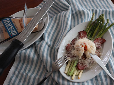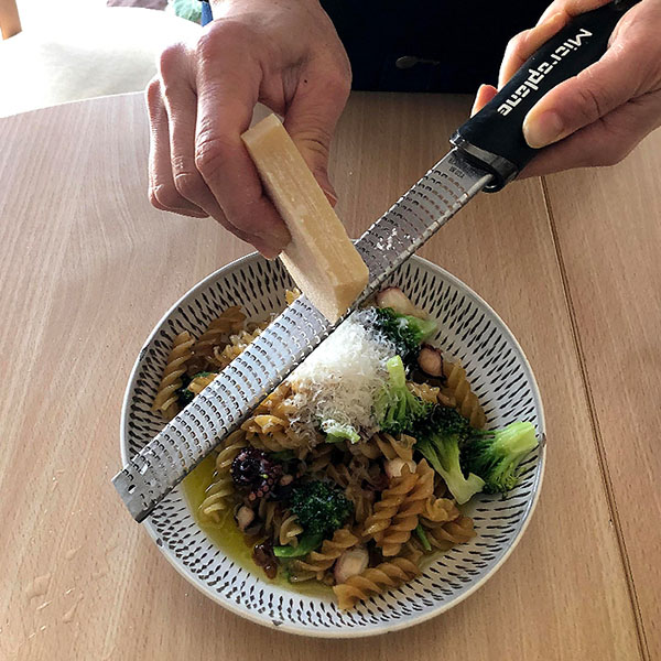 はじめて出会ったのは料理教室で。まるでレストランで出されるかの様なふわふわチーズが削れてゆく様に感動しました。チーズ以外ではレモンや柚子などの皮を削ってお料理にかけたりするのにも良い道具です。まずはパルメザンチーズをパスタに削ってみました。「ストップと言ってね〜」なんて言いながらたっぷりかけるのが、ちょっと贅沢気分で楽しかったです。