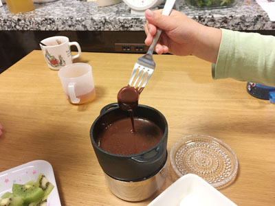 フルーツやマシュマロをとろーりチョコにつけて食べるチョコフォンデュ。店長小林がチーズフォンデュにぴったりといっていたのでロッジのココットにいれました。温めた生クリームに刻んだチョコをいれて溶かしてフルーツをカットして...と用意は簡単だったのに、子どもたちも大興奮で楽しんでました。ティーウォーマーにのせていればあたたかいままです(ココット自体が温まるまで少し時間はかかりますが)。冬のホームパーティーなどにおすすめです。