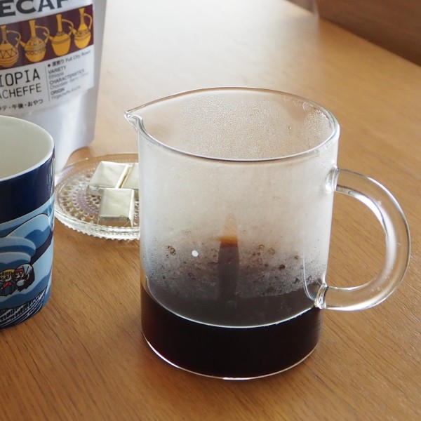 コーヒーを淹れる時は1人分を用意することが多いのでドリッパーをマグにのせて淹れていて、コーヒーサーバーは使っていませんでした。でもそれだと2杯分淹れる時はティーポットをサーバーとして代用するなど少し不便で、KINTOのコーヒージャグを使うように。洗いやすさが購入時の最重要ポイントの私にとって、ストンとしたシンプルな形状がお気に入りです。コーヒーサーバーとしてだけでなく、バーミックスのミキシングカップとして卵白や生クリームを泡立てる時にもたまに使っています。