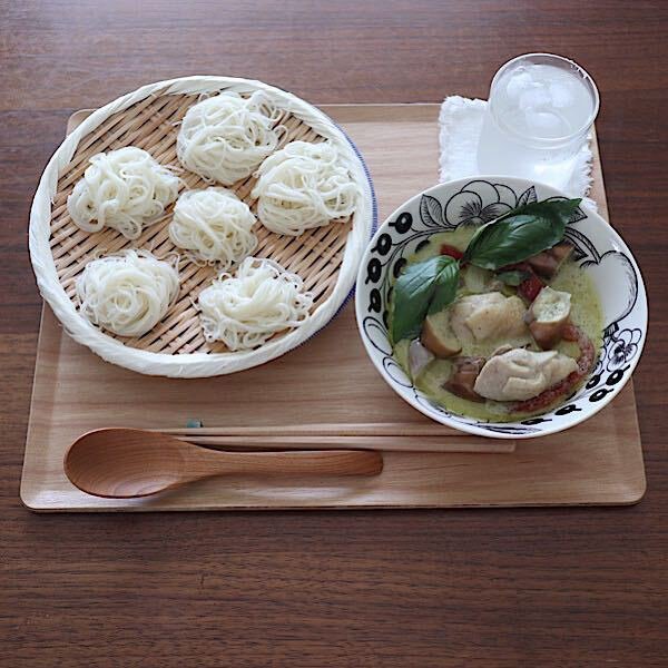 在宅でのランチは時間も限られているのであまりキッチンを行ったり来たりしたくない・・そんなときにはこのトレイが大活躍! この日のランチはグリーンカレーとそうめんでつけ麺風にしました。ブラックパラティッシのスープボウルと21cmの盆ざるを乗せられるサイズ。このトレイに乗せて食卓へ、食べ終わったらそのままキッチンへ持っていってすぐに片づけられます。まさに時間のないランチタイムにはもってこいです。
