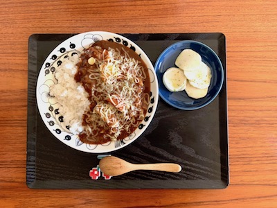 ある日の昼食。自分ひとりだと適当もいいところなので雰囲気だけでも、とキントーのプレイスマットを取り入れています。トレイに載せたところと載せないところの比較写真を紹介したいほど、きちんと感が生まれ全体がピシッと整います。今日はプレートは21cmに昨晩の残りのカレーを。薄手でスタッキング収納できるところも気に入っています。