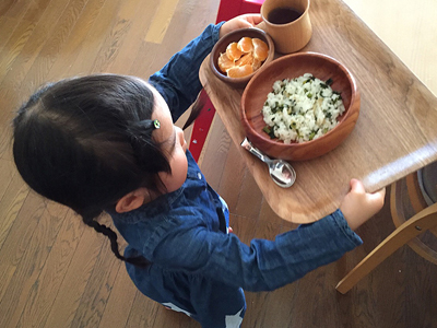 「ずんずるべー、ずんずるべー♪」と歌いながらお昼ごはんを運ぶチビ。自分で自分で!と何でもやりたがるのは良いのですが、こぼされて困るのは母なのです…。自分の目線の高さのテーブルに背伸びして持ち上げたっ!しかしノンスリップはこんなに傾けても大丈夫。「ずんずるべー」は「ジングルベル」でした…苦笑