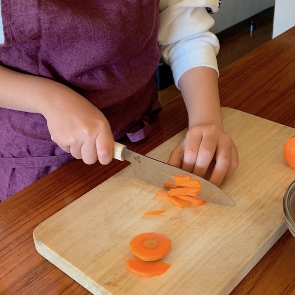 こどもの包丁は切れ味が良いとのことだったので、いつもはレンジで加熱して切りやすいようにしていたニンジンを生のまま切ってみることに!はじめこそ、力加減が分からないようでしたがすぐに慣れ、固いニンジンもトントンとリズムよく切れました。本人にインタビューしたところ「いつも使ってるのより安心して切れる!もっと切るのない?」とのこと。木のハンドルも手が滑らずしっかり握れたみたい。母の夢は仕事から帰ってきたら「ごはんの準備しておいたよ」のシーン。夢に一歩、近づきました。
