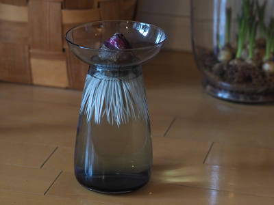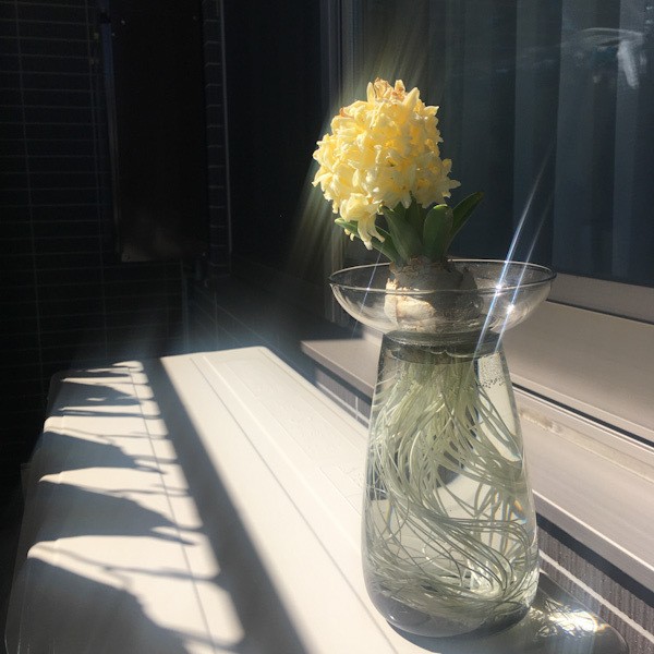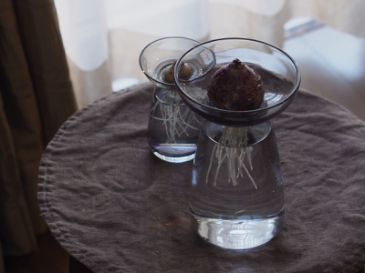 こどもたちの保育園で毎年ヒヤシンスを育てているのをみて、いつか我が家でもトライしたいと思いつつ早やうん年。。。とうとう今年は水耕栽培用の球根を買うことができました(いつもやろうやろうと思っている間に時期をのがしていました)。KINTOのアクアカルチャーベースはこのくすんだグレーがインテリアになじみます。上皿を外して切り花を活けるのも楽しみです。