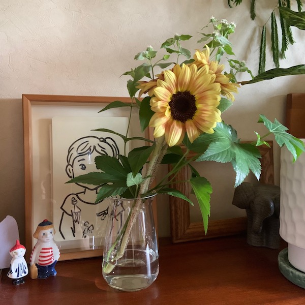 毎月、旬の花を2〜3本買って部屋に飾っています。7月はひまわり。一目惚れしてお持ち帰りしたのは真ん中のところが、ほんのりオレンジ色に染まった品種のもの。生花を飾るときはキントーのLUNAベースを愛用しています。真鍮のプレートはそれだけで雰囲気があり「花一輪」がサマになるので、いつもは一輪挿しとして使うことが多いですが、この日はグリーンも一緒に購入したため、真鍮製のプレートを外してサクッといけました。いつもより爽やかにまとまり新鮮!じゃないほうの使い方もおすすめです。