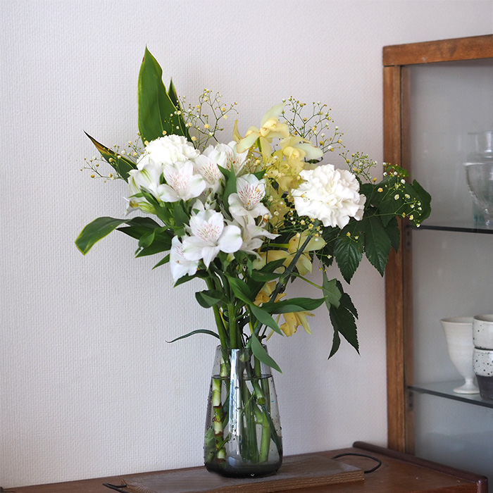 仕事で上京していた親戚が空き時間を使い会いにきてくれました。その時の手土産がこちらの花束。センスの良い彼女らしい手土産です。大きめの花瓶はデコラティブな物しかないなーと納戸をガサゴソしていたら、こちらが目に留まり、上皿を外して生けてみると中々上出来。上窄まりな形状なので花の収まりも◎。