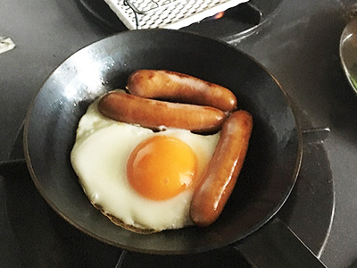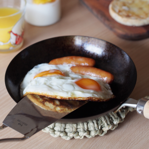 鉄のフライパンで焼くことで、より一層美味しくなる食材があります。そんな時は表面加工派の私もリバーライトのフライパンを出します。中でも20cmは気軽に出せて、ソーセージやベーコン、野菜などを焼いて「そのままテーブルへ」が出来るサイズ感。この日はグルグルと渦巻きになっているソーセージを丸ごと焼きました。熱々のまま食卓へ!家族も盛り上がっています。鉄なら直接フォークとナイフで切り分けてもへっちゃら。うーん、パリッとジューシー!