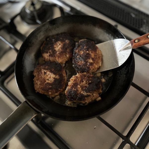 あと一品、なにか足りないなーという時によく登場するちょこっとフライパン。れんこんを炒めてきんぴらにしたり、小松菜と油揚げの炒め煮をつくったり、冷蔵庫にあるものを炒めるだけで一品できちゃうのでとっても便利。今日は切り身魚がメインだけれど、もう少しボリュームが欲しいと思ってあと一品メニューにミニハンバーグを作りました。ぴったりの蓋もあるので焼き目をつけたら蓋をしてふっくら。ミニ ターナーとセットで使ってます。