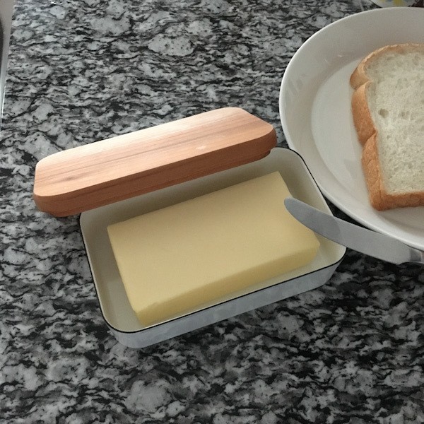 朝はバタバタするのでいつもはパンにおいしいよつ葉バターを使うのですが、仕上げ用のカットバターを使いたいときはバターケースにいれた有塩バターをカットします。野田琺瑯のバターケースは裏返した木の蓋でカットでき、琺瑯部分は油汚れもしっかり落ちるのでとても便利。気づけば購入から10年近く活躍しています。