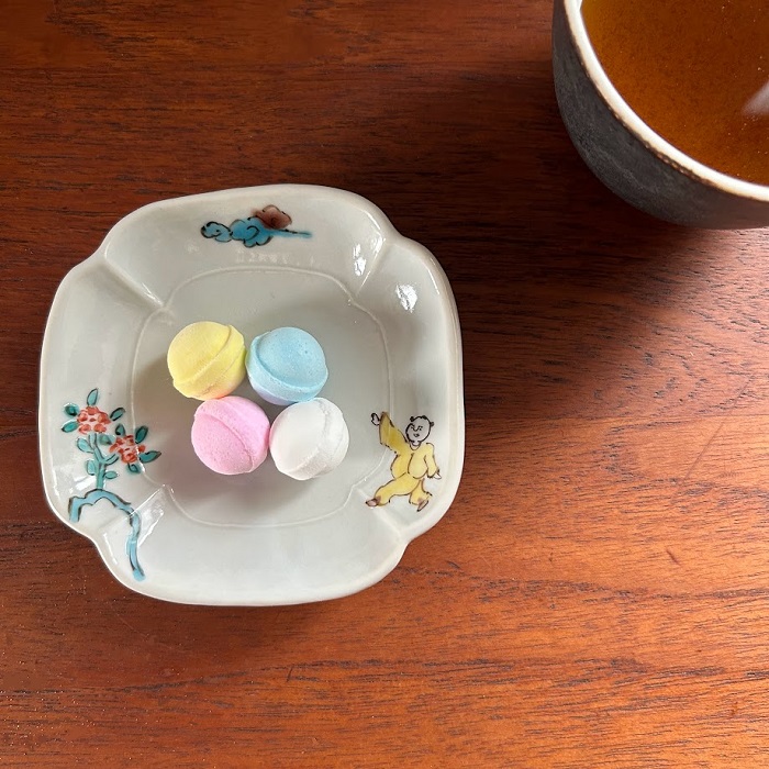 堀畑蘭さんの唐子が描かれた豆皿、去年はどれにしようか迷っているうちに売り切れ。会社にあるサンプルから選んだうちの1つが【色絵唐子とお花】。1年待って、ようやくプロキッチン陶器市で手に入れることができました!黄色い服の唐子と赤い花、空には筋斗雲のような雲が描かれ、同じ絵柄でも1枚1枚表情が違うのが魅力的。おやつにも食事にもぴったりです。