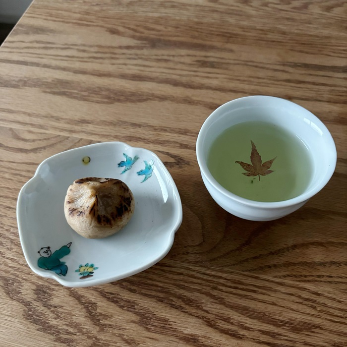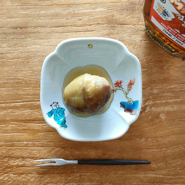 堀畑さんの描く唐子の表情と、食べ物を載せた時の構図がたまらなくかわいい隅入豆皿。どれにするか迷いましたが、子供がスキップしているように見えるこの赤松にしました。実家からのふるさと便で届いた立派な栗を茹でて、メープルシロップをたらり。滋味深いデザートになりました。縁起の良い絵柄はお正月にも活躍しそうです。