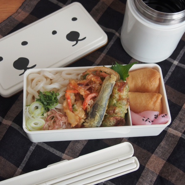 容量が500mlで6cmとそこそこ深さもあるのでうどんに天ぷら数種、仕切りを使って小さめのいなり寿司を2つ入れることもできます。普通のお弁当にあきたらこんな風にちょっと変わり種を試してみるのはいかがでしょうか?スープジャーにめんつゆを入れれば液漏れも気にすることなく持ち歩けるのでおすすめです。夏は氷を入れて冷たいつけ汁、冬はあたたかいけんちん汁や豚汁の残り、カレーをお出汁で溶いたものもおすすめです♪