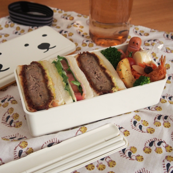 ジェルクールシリーズの良いところはなんといっても蓋が保冷材になっていることなのですが、それよりも私が気に入っているのは蓋に書かれたふたごのしろくまたち。右側のくまは少し小さいのがまたかわいい。そんなゆるかわなじぇるく~ま、内容量は500mlとたっぷり入るのもうれしいポイント。今回のメンチカツサンドとトマトチーズサンドみたいに具材たっぷりなサンドイッチにすると、パンでも満足度の高いお弁当になりますよ。