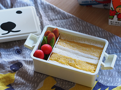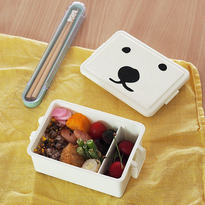 まだ幼い娘は電車の中でおとなしくしていられません。外房の別邸へ行く時は今ハマっている折り紙と必ずお弁当持参で乗り込み、外房線に乗り換えるとお弁当タイム。普段は曲げわっぱですが、夏場は食中毒の恐れがあるので保冷フタ付きのこちらのお弁当箱にしました。冷えても美味しいサンドイッチ弁当が定番です。「クマちゃんのお弁当箱~!」とフタを開ける前から喜んでいます。