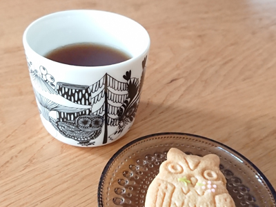 お友達からかわいいクッキーをいただいたのでフクロウが描かれたカップでティータイムにしました。同じサイズのマグカップも持っていますが、取っ手なしのほうが用途が広がるように思います。飲み物だけではなく茶碗蒸しやプリンを作る時にも使っています。