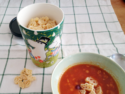頂き物のムーミンパスタ。ムーミン、ニョロニョロ、ミイ、スナフキンの4種類が入ってます。茹でるとちょっと大きくなって、さらにかわいい♪ムーミン・ジャーに入れて冷蔵庫で保存しています。