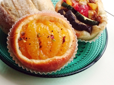季節の果物がのったパンが大好きです。今回は甘夏とクリームチーズのパンをセレクト。一緒に夏野菜カレーとオリーブのパンを購入しました。少し深みのあるエメラルドカラーでパンがさらに美味しそうに!あっという間にいただきました。