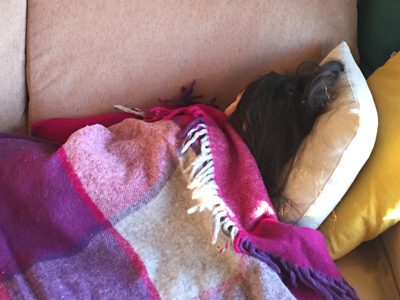 娘の声がしないなぁ・・・と思ったらソファーでうたたねをしていました。冬になるとソファーの上にはいつもツイードミルのスローがあるので、誰かしらが包まっているのが我が家の風景。使いこんでいくうちに、くったり柔らかな肌触りになってきました。いい感じです。でも、そろそろ毛玉取りしなくちゃ。