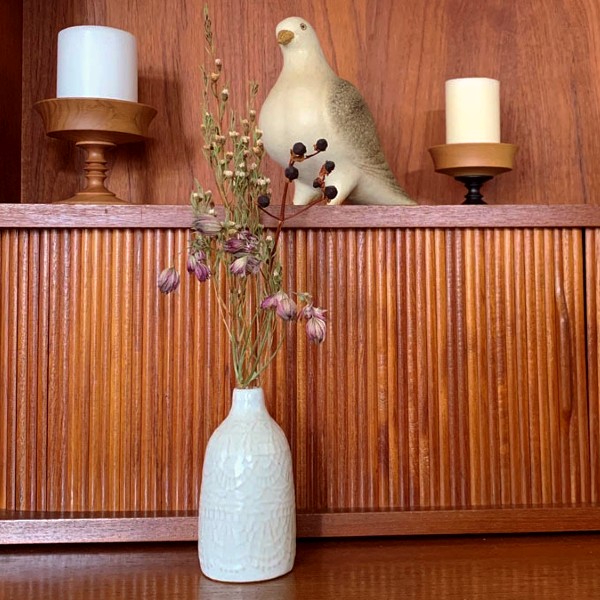 どことなくアンティークのような佇まいのドイリー。薄茶色の地に白い釉掛けをすることで浮き出たレースの模様がすてきな花瓶。生花を生けるのはもちろん素敵ですが、私はドライフラワーを飾るのが気に入っています。そのまま棚に置いておくだけでもおしゃれで、インテリアとして飾る場合はMとSサイズを並べて置くのがGood◎