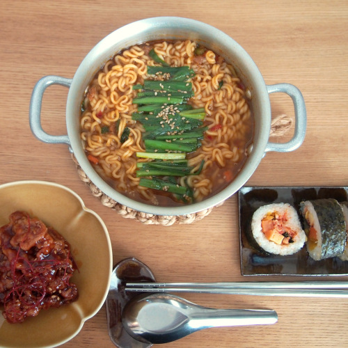 辛ラーメンの作り方って、日本の袋麺と違ってスープを溶かしたお湯で麺を煮るって知ってましたか?以前、ちゃんと作り方を読まずに後からスープを入れていた自分に教えてあげたいくらい、段違いでおいしさが違います。直径15cmの外輪鍋は辛ラーメン一袋分がぴったり入る大きさなので、私は作ったらそのまま丼として使っちゃっています(洗い物も減りますしね!)ちなみに辛ラーメンにニラと白ゴマのトッピングがおすすめです◎