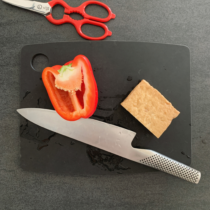 私はまさに福袋のセットで包丁を研いでおります。我が家にあるのは使い込まれたグローバル。グローバルの包丁にはシャープナーが付属しますが、砥石で研ぐのとは全く切れ味が違います。砥石なら月に一回研げば気持ちよく使えますが、シャープナーはかなりこまめにメンテナンスが必要。スタッフ中澤の包丁研ぎワークショップを受けてから、自分でしっかりと研げるようになりました!スパッと野菜の断面も豆腐の断面も気持ちよく綺麗!作業が捗ります。