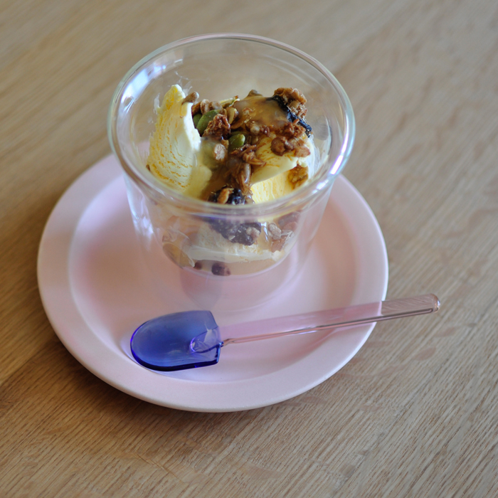 アマブロのSNOW SHOVELはその名の通り「アイス」にピッタリ。ガラスの優しい口当たりはステンレスや木製ともまた違って、ひと口運ぶごとにニコニコ。キントーのダブルウォールをデザートカップにすれば温度を長く保てるのでアイスクリームも溶けにくく、温かいお部屋でも最後まで美味しくいただけます。グラスとガラスのスプーンは良いコンビネーション!SNOW SHOVELは可愛らしい箱入りなので小さなギフトにもおすすめです。