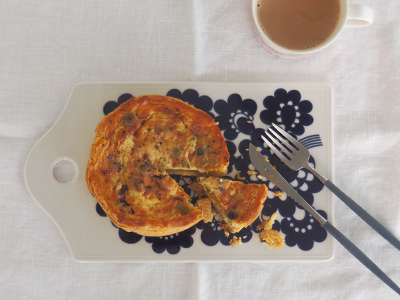 カッティングボードのような形のサービングプラター、一瞬躊躇してしまう形かもしれませんが、テーブルでちょっとカットしたいものを気軽にのせられてとっても使い勝手がいいんです! エステリのシリーズは花柄がテーブルを華やかにしてくれますが、このブルーが可愛い過ぎずお気に入りです。