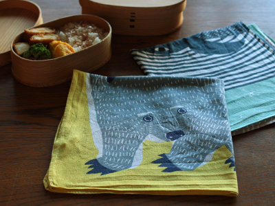 秋晴れがうれしい日、我が家の兄妹は全校遠足でした。むす美のお弁当包みは動物の表情がかわいくて子供たちもお気に入りです。今日は妹がくま、兄がクジラで出発です。