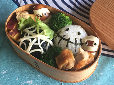 娘が小学校のお弁当の日にキャラ弁がいいというので、精一杯頑張ってハロウィン弁当を作りました。小学校に曲げわっぱを持って行くと、キャラクターのお弁当箱が多いなか注目されるそうです。ご飯が美味しくなる♪ と娘も気に行ってくれています。