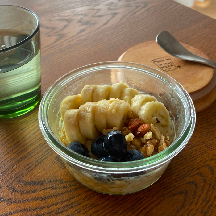最近朝ごはんをオートミールに変えてみました。もうすぐ恐怖の健康診断があり、いつも貧血判定が出てしまうので、少しでも良い結果(付け焼き刃感…)であるようにはじめた新習慣。わたしの好みはオートミール30gと水切りヨーグルトを混ぜたもの。それにちょうどよかったのがウェックのモールドシェイプ240mlでした。木蓋をして冷蔵庫に一晩寝かせて、朝フルーツやナッツをトッピングをするのにも口径が大きいので盛り付けやすいです。