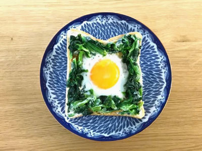 今日の朝食は、ほうれん草と目玉焼きのトースト。オスティンディアのプレートはトーストにぴったりの大きさです。藍色で描かれた細かな絵柄に食べながら見入ってしまいます。