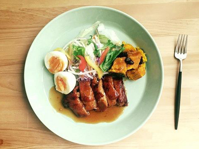 鶏の照り焼きはご飯にのせて「照り焼き丼」も好きなのですが、今日は付け合わせに卵、かぼちゃ、野菜もたっぷりのせていただきます。丼より野菜がたくさんとれて、ちょっとうれしいです!