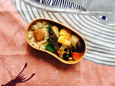 うちの家族は、ほぼ毎日お弁当持ちなのですが、夏場はなかなか大変です。少し濃いめに味付けした焼き魚と煮物、卵焼き、玄米ご飯に梅干し。なんだか茶色っぽいお弁当ですが、お弁当包みの布を変えるとちょっと気分も変わります♪