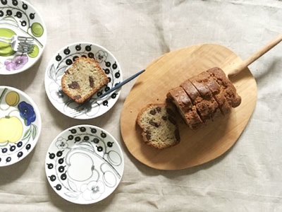 今日はおやつに黒ごまとチョコのパウンドケーキを焼きました。横幅は30㎝くらいありますが、丸みを帯びた形のおかげでテーブルに出してもかわいいカッティングボードです。