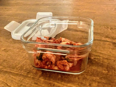 久しぶりに買ってきたキムチ!家族もみんな好きなのですが、冷蔵庫に入れるとにおい移りが気になって...。その話をすると「グラスロックなら大丈夫だよ」と周りのスタッフのオススメもあって、使ってみたら本当に大丈夫でした!他にもいろいろ試してみようと思います。