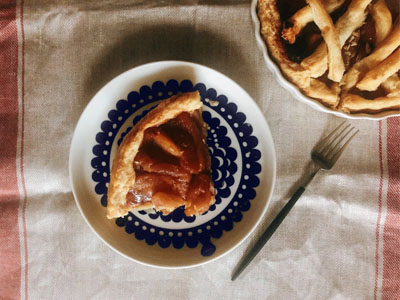 北欧らしい白地に青のお花のモチーフのエステリは、懐かしさを感じられるデザインながら日々の食卓のいろいろなシーンに使えるお気に入りのシリーズです。シンプルなアップルパイもエステリのプレートに載せるとおいしさが引き立つような気がします。
